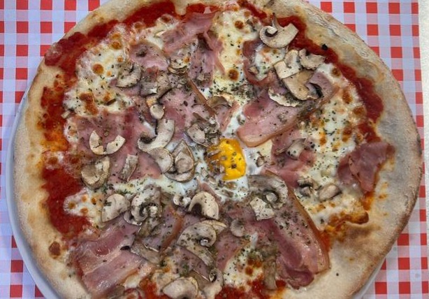 Tomate, mozzarella, jamón cocido, bacon, huevo, champiñones y orégano.